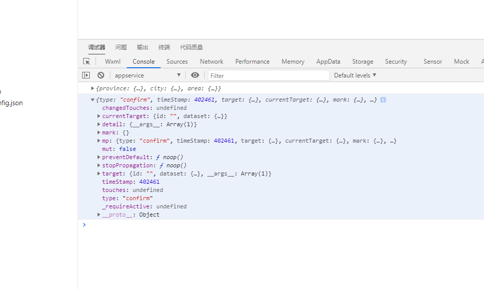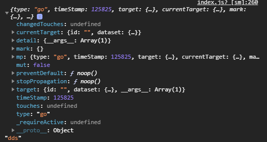 {type: "go", timeStamp: 373392, target: {…}, currentTarget: {…}, mark: {…},…}changedTouches: undefinedcurrentTarget: {id: "", dataset: {…}}detail: {__args__: Array(1)}__args__: Array(1)0: 1length: 1nv_length: (...)__proto__: Array(0)__proto__: Objectmark: {}mp: {type: "go", timeStamp: 373392, target: {…}, currentTarget: {…}, mark: {…},…}mut: falsepreventDefault: ƒ noop()stopPropagation: ƒ noop()target: {id: "", dataset: {…}, __args__: Array(1)}timeStamp: 373392touches: undefinedtype: "go"_requireActive: undefined__proto__: Object "dds"
