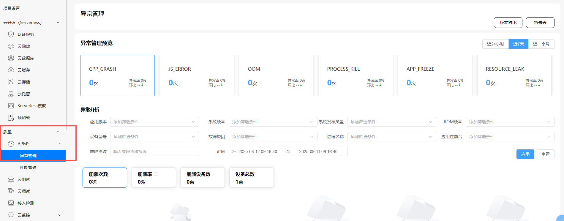 您提到的“质量-崩溃”菜单已整合至 APMS(应用性能管理服务) 下的 “异常管理” 模块中。开发者如需查看和分析应用的崩溃数据,应访问此新路径。