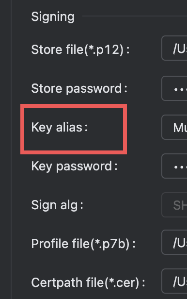 build-profile.json5或signingConfigs中配置的keyAlias是否与.p12或.jks证书文件中的别名完全一致(区分大小写)。 -