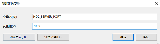 在此电脑 > 属性 > 高级系统设置 > 高级 > 环境变量中,添加HDC端口变量名为:HDC_SERVER_PORT,变量值可设置为任意未被占用的端口,如7035。