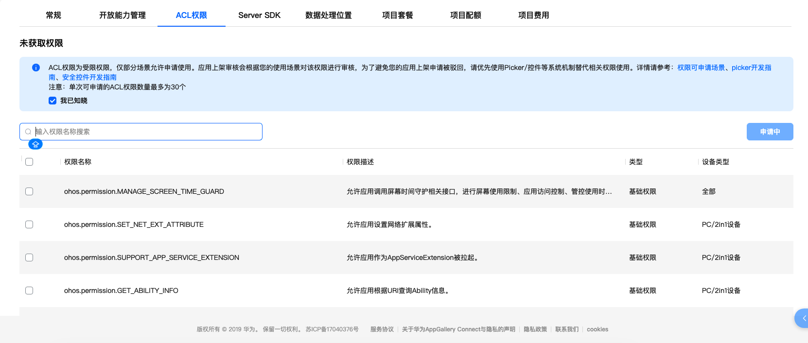 HarmonyOS鸿蒙Next中申请ACL权限优化 项目申请ACL权限这里,至少给个提示可以一次勾选多个一并申请呀,我申请了一个回来一看要等审核过了才能申请第二个就无语了,而且多选后在列表页我都不知道我都勾选了哪些权限,希望能优化下页面功能吧
