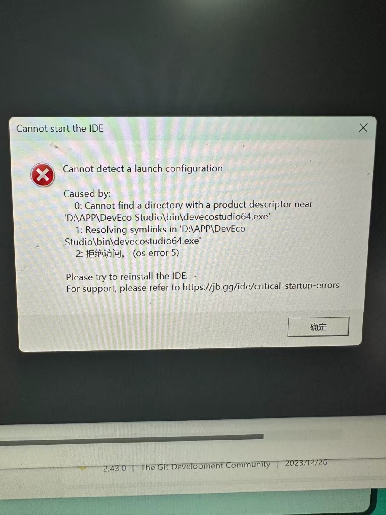 根据你提供的截图,错误发生在IDE启动阶段,因此重点应放在IDE本身的安装和权限配置上。重新安装时,请确保网络连接正常,以便IDE能正确下载和配置必要的组件。