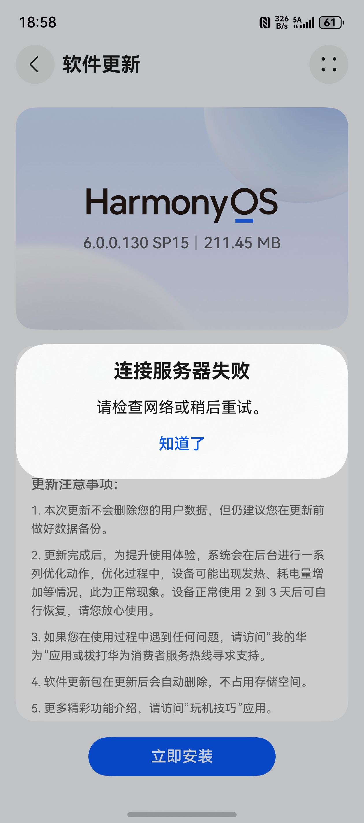 - 解决方法:请删除当前下载的升级包,重新进入“设置 > 系统和更新 > 软件更新”,下载完整的系统安装包,并确保在升级过程中不进行任何操作(如接打电话、运行大型应用),直至升级完成。
