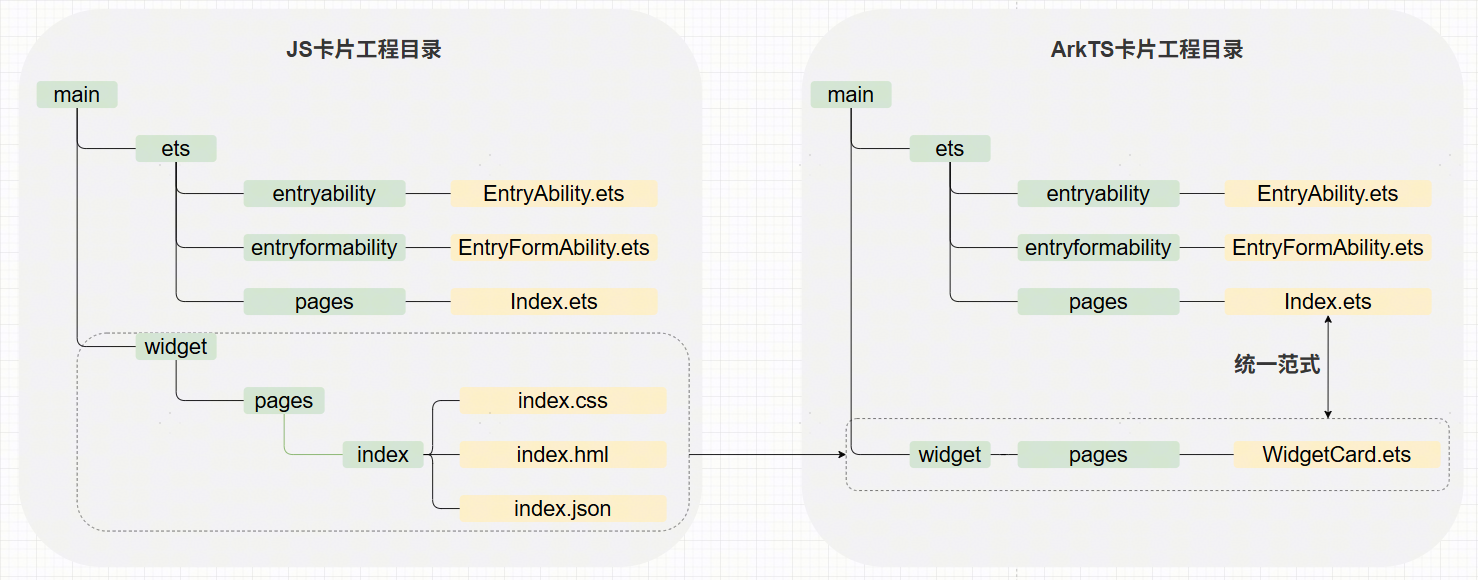 - ArkTS卡片统一了卡片和应用页面的开发范式,应用页面的布局可以直接复用到卡片布局中,提升开发体验和开发效率。具体请参考图1 卡片工程结构对比。
