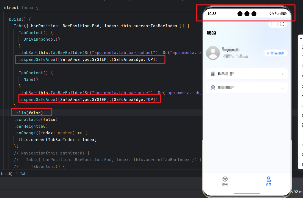 clip属性设置为false,以避免内容被裁剪。这是实现沉浸式的基础。Tabs() { // TabContent... } .clip(false) -