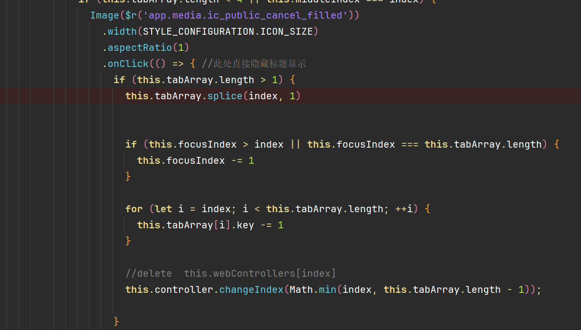 - 实现页签和页面视图的联动。主要是通过TabsController的changeIndex来实现对应的视图跳转,但需注意由于之后会有增删数组元素的操作,所以此处传入的index值是数组元素的索引值: