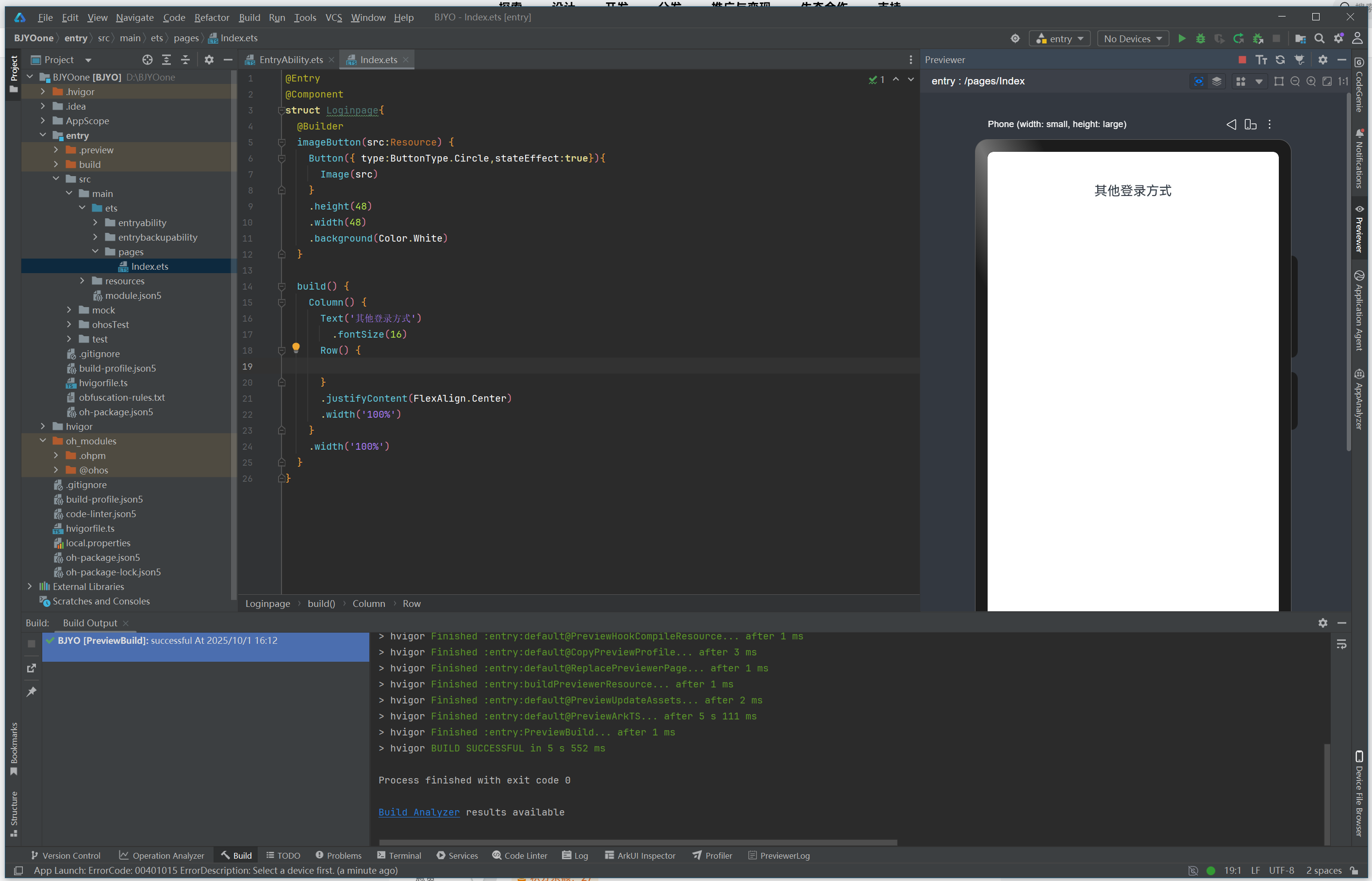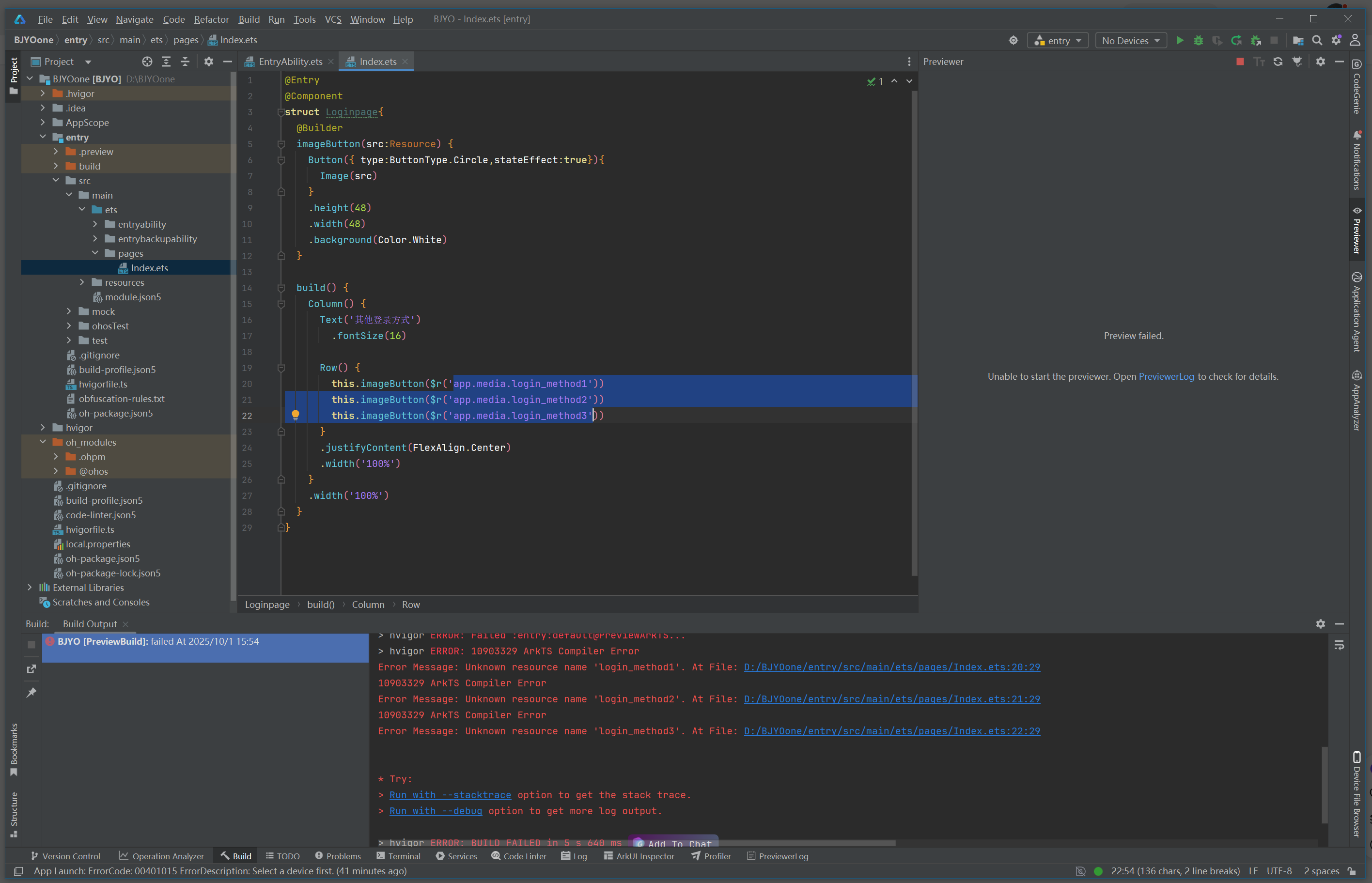 imageButton是一个组件构建函数(在ArkUI中通常通过链式调用或装饰器声明,但此处代码片段显示的是构建器模式)。$r('app.media.login_method1')是资源引用语法,用于获取放置在工程resources > base > media目录下的图片资源(例如login_method1.png)。 -