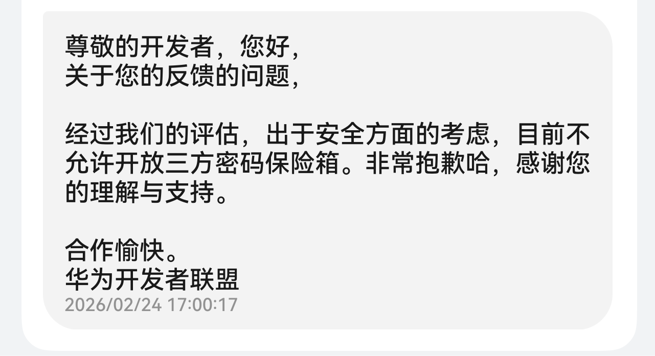 HarmonyOS 鸿蒙Next是否支持第三方密码保险箱设置为系统默认保险箱??? 我们在考虑做一个全平台全系统的密码保险箱,但是现在不知道鸿蒙是否支持,看到老版本的ios和安卓是可以的(系统设置里面-----隐私和安全----密码保险箱----切换默认密码保险箱),鸿蒙目前是否支持这个功能???