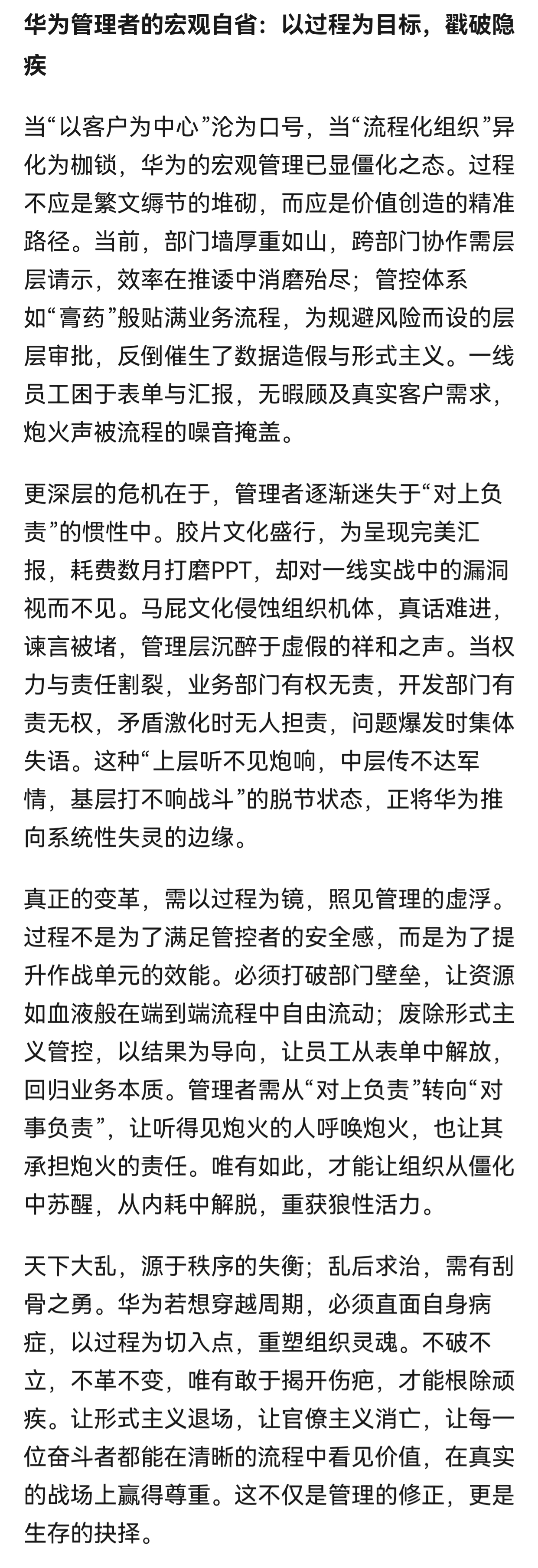 天下大乱,源于秩序的失衡;乱后求治,需有刮骨之勇。华为若想穿越周期,必须直面自身病症,以过程为切入点,重塑组织灵魂。不破不立,不革不变,唯有敢于揭开伤疤,才能根除顽疾。让形式主义退场,让官僚主义消亡,让每一位奋斗者都能在清晰的流程中看见价值,在真实的战场上赢得尊重。这不仅是管理的修正,更是生存的抉择