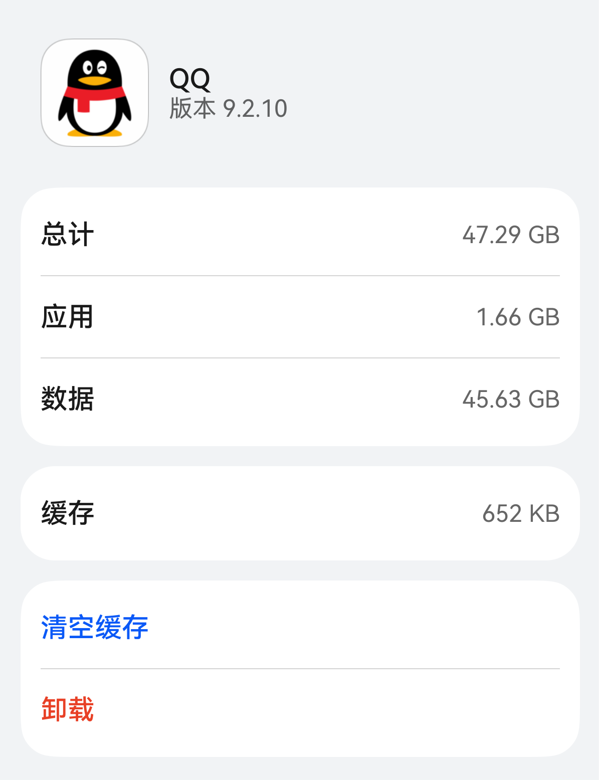 根据您提供的截图和描述,您遇到的问题是应用(如QQ)占用了大量存储空间,但在HarmonyOS Next的当前应用管理界面中,只有“卸载”选项,缺少了传统安卓系统中常见的“清除数据”功能。