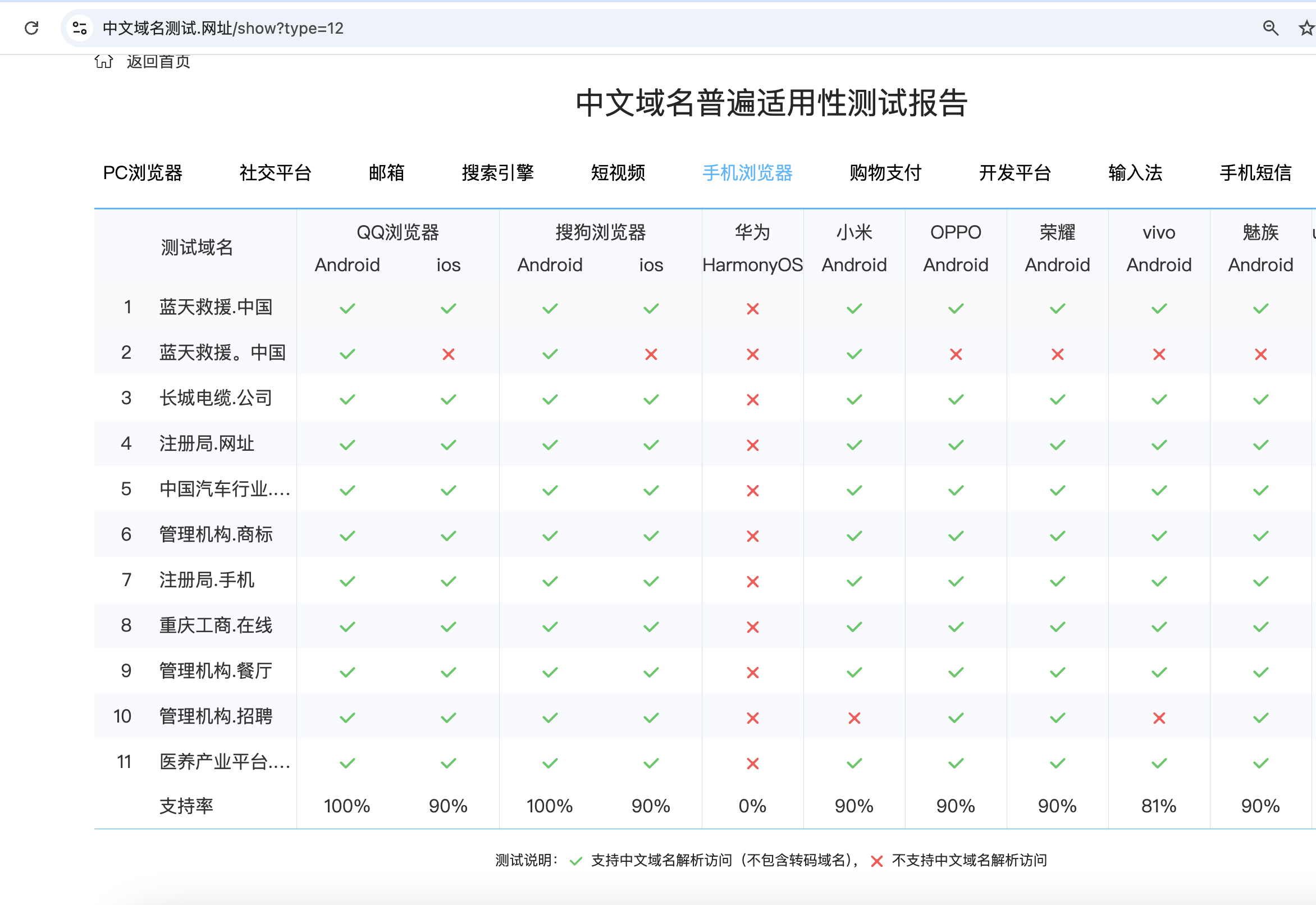 目前国内就华为的浏览器还不支持中文域名的准确展示,展示一串乱码,希望能尽快改进。