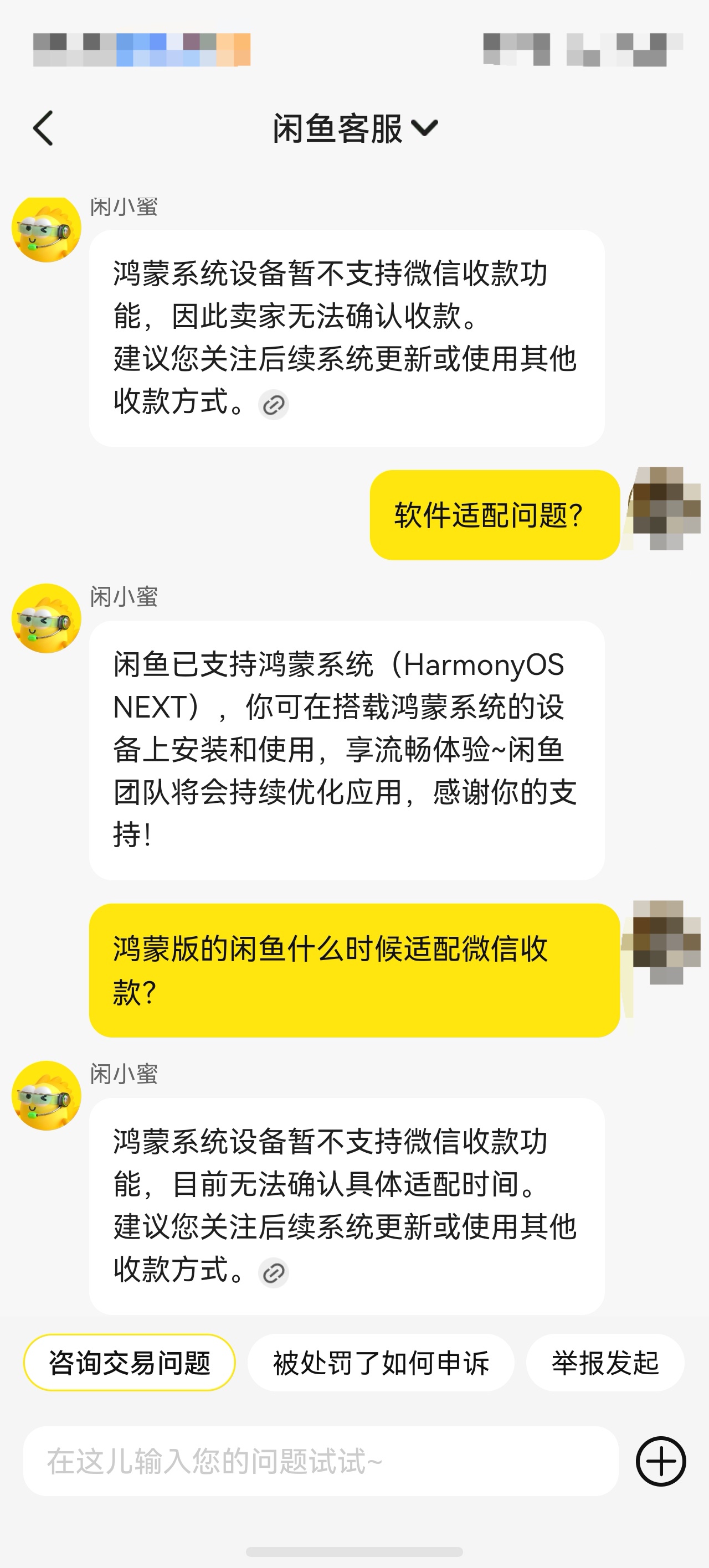 总结来说,此问题需等待闲鱼发布针对HarmonyOS Next的兼容性更新。目前请优先通过更新应用或更换交易方式来规避。
