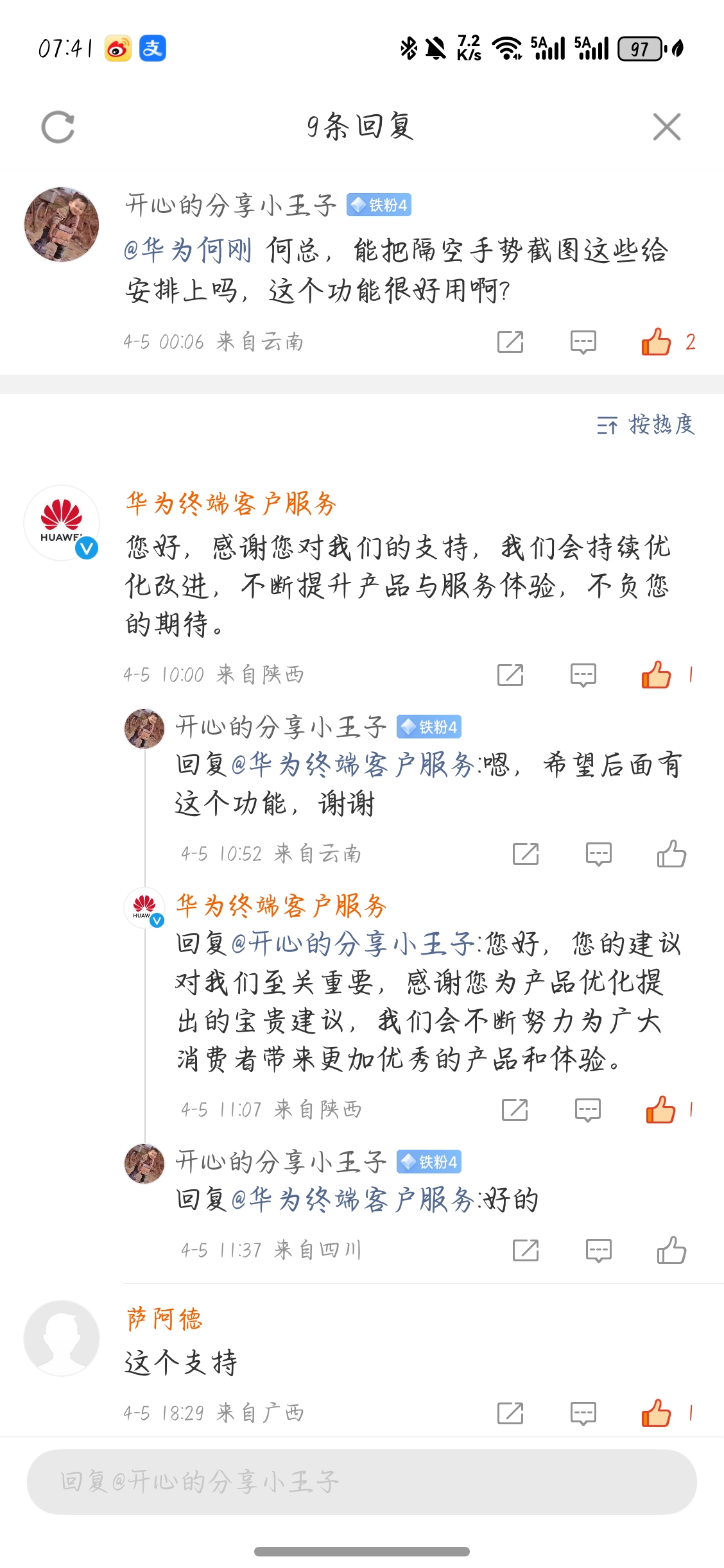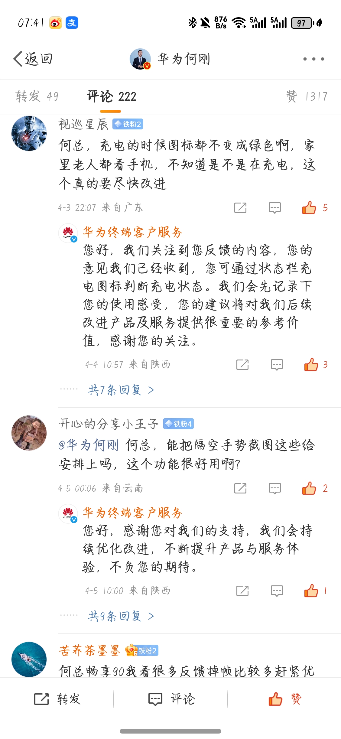 您在何刚总微博下的反馈已被看到,终端回复“持续优化”表明用户需求已传递至相关团队。新功能的推送会综合考虑硬件能力、系统适配、测试验证等多方面因素。