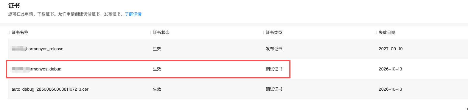 - 场景二:请确保profile文件是由配置中的.cer文件生成的,可以登录AppGallery Connect,选择“证书、APP ID和Profile”,在左侧导航栏选择“证书、APP ID和Profile > Profile”,进入“Profile”页面,选择配置的profile文件,右侧操作点击“查看”,确认“查看Profile”页面中“归属证书”是否与配置的.cer文件一致。