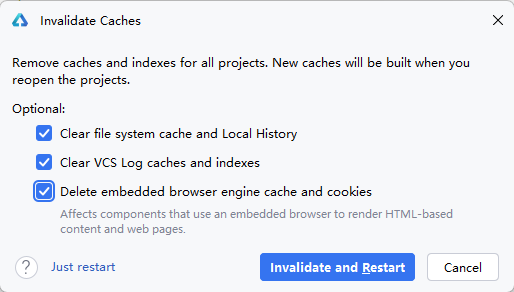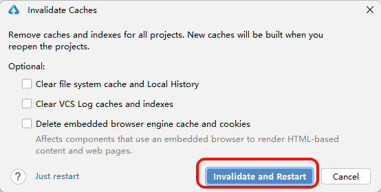 可清除底座索引后重启:菜单栏File->Invalidate Caches…,全选并点击Invalidate and Restart。