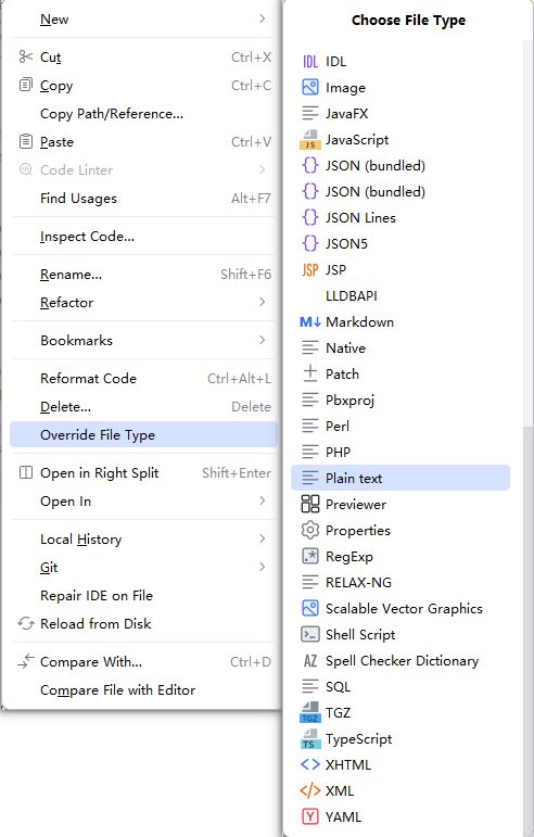 - 如果是索引卡在某个文件,可以将该文件排除索引:右键该文件->选择Override File Type->Plain Text。