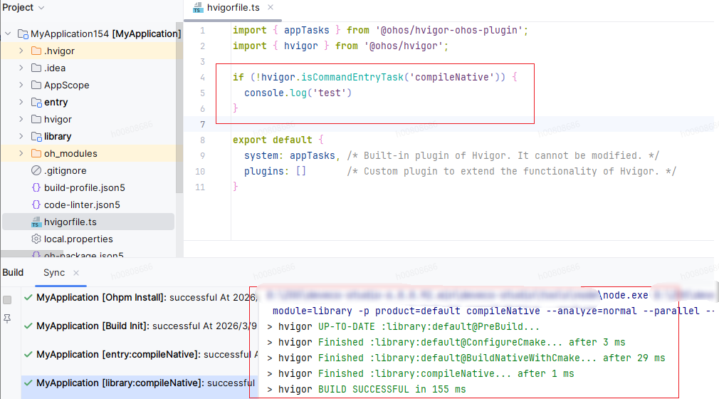 代码4-6行添加了**!hvigor.isCommandEntryTask(‘compileNative’)** 的判断后,console.log(‘test’)的日志在compileNative模块不会被执行。