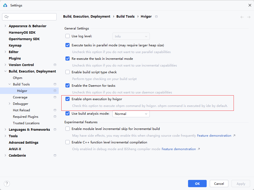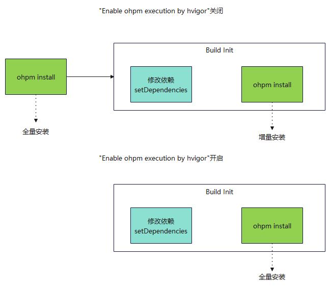hvigor采用“Enable ohpm execution by hvigor”开关支持ohpm install合一,优化性能。“Enable ohpm execution by hvigor”打开后,ohpm install会统一在hvigor的setDependencies中调用,减少一次增量ohpm install,优化性能。