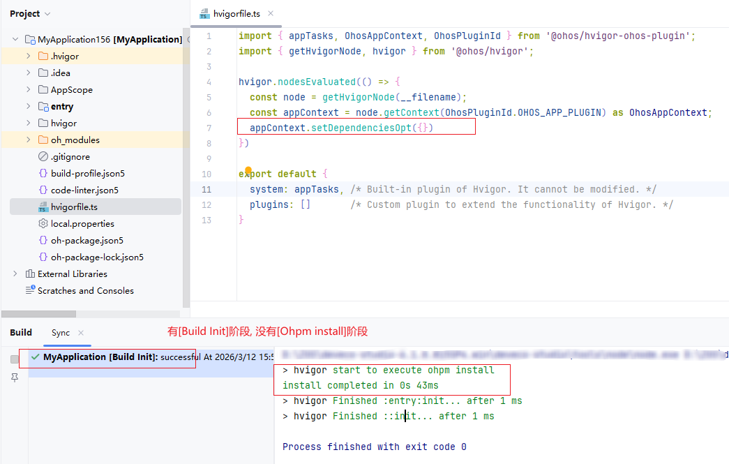 !hvigor.isCommandEntryTask('compileNative')判断,跳过与C++编译无关的逻辑重复执行。 - hvigor脚本使用setDependenciesOpt修改依赖,导致两次ohpm install:开启