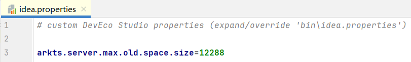 为避免工程代码量过大导致语言服务启动失败,请根据工程代码量和开发环境内存大小配置合适的LSP Server进程内存上限。以配置内存上限为12G举例,打开DevEco Studio,通过菜单栏的Help > Edit Custom Properties…,打开idea.properties配置文件。在文件中新增一行arkts.server.max.old.space.size=12288,然后重启DevEco Studio。LSP Server进程的内存上限将设置为12288M(即12G)。